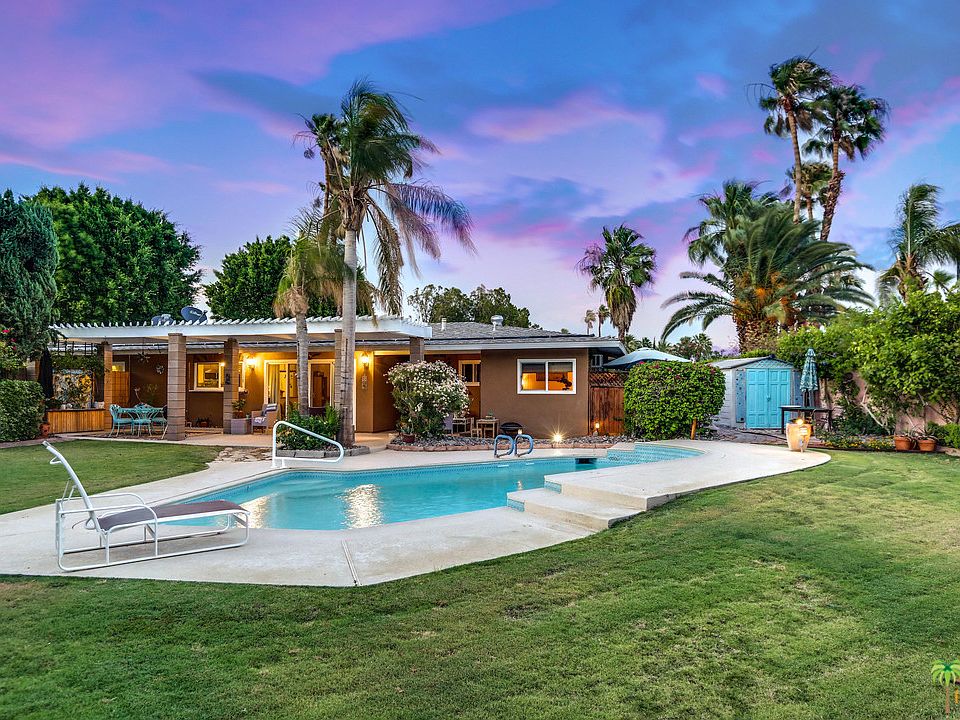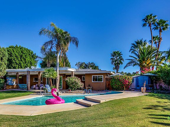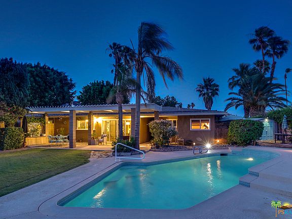 This completely private and gated 2 bed/2 bath home has been meticulously maintained in one of Palm Springs most sought after neighborhoods, El Rancho Vista Estates. Situated on a quite cul de sac, beautiful gardens wrap the home. This home includes a nice sized bonus room with separate entrance that can be used as an office or media room. Slab granite counters in the updated kitchen, dual pane windows and sliding glass doors and beautifully polished Saltillo floors throughout. Extra storage conveniently located in the carport. Seperate laundry room. The master bedroom has an en suite bath and guest bedroom has private patio. The gracious outdoor veranda is perfect for al fresco dining next to the large swimming pool and outdoor shower while enjoying the unobstructed westerly views of Mt San Jacinto. Don't miss this opportunity to own this beautiful home, just minutes from down town Palm Springs, for under $500K. Buyer to verify square footage.
