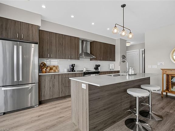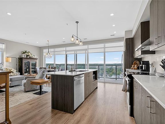 Located in the heart of historic downtown Galt, this beautiful condo is part of the vibrant Gaslight District—a new center for residential, commercial, retail, dining, art, and culture. Here, life, work, and leisure come together to create an unparalleled living experience. This stunning unit has amazing SOUTHWEST exposure with unobstructed views and is bright all day long with stunning sunrises and sunsets! This impressive unit boasts nine-foot smooth ceilings, potlites, custom roller shades on remotes, custom mirrors, luxury flooring, and has been recently painted in neutral Benjamin Moore shades throughout. The gorgeous open kitchen has modern cabinetry, quartz countertops, a tile backsplash, an oversized island with an under-mount sink and chrome hardware and faucet. A Custom dining room chandelier and pendant lighting were recently added. It is complete with SS appliances. The open-concept design flows to a generous living and dining area, ideal for entertaining. Floor-to-ceiling windows and access to a large balcony let natural light flood the space. The primary suite offers wall to wall full sized patio doors leading to the balcony, as well as wall to wall closets, and a luxurious four-piece ensuite with dual sinks and a walk-in shower. A second bedroom with floor-to-ceiling windows, a four-piece bath with a tub and shower combo and two full closets and in-suite laundry complete this premium unit. Residents enjoy stunning amenities to include luxurious hotel-style lobby, secure video-monitoring, a fitness centre and yoga studio, large TV, a catering kitchen, a private dining room, and a cozy library. The lounge opens onto a spacious outdoor terrace overlooking Gaslight Square, featuring multiple seating areas, pergolas, fire pits, and a BBQ area for outdoor relaxation. Simply Stunning!