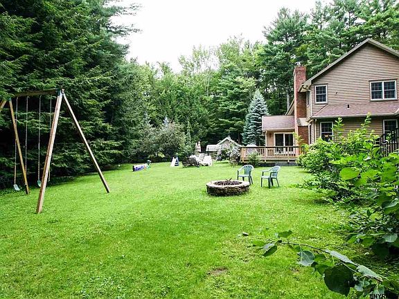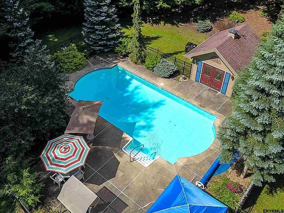 Patanian-built attention to details, w/ crown moldings & hardwood inlays at fireplaces. Forever-wild acreage ensures your privacy, yet 15 mins. to I-90, East Greenbush and Troy. Add'l feat. incl. 50-yr lifetime shingles; reverse osmosis at kit sink; built-in safe; 5.1 surr. sound system; heated saltwater pool; hot tub hookup; lg. deck; fenced pool, firepit and yard space; freshly painted house; sep. pool & garden sheds. Basement family room, pantry and cabinetry to create wine bar or kitchenette. STAR $556