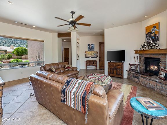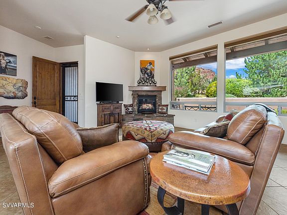 Beautiful Sedona home meticulously maintained. Featuring outstanding red rock views from front courtyard, great room and dining room. Everything you want including stained glass, solid wood doors throughout, Hunter Douglas ultra-Glide window coverings, custom cabinetry in kitchen with granite counters and stainless steel appliances. Beautiful stacked moss rock fireplace in living room to cozy up to on those cool nights. Two great outdoor living spaces including large front courtyard and private backyard patio to sit back and enjoy. Lots of storage. Furnishings are included.