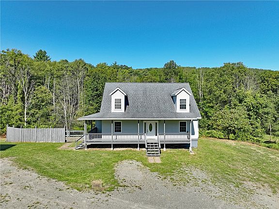 This well-built 3-bedroom, 2.5-bath Cape Cod home sits on 24.5 acres featuring a creek, mature trees, and plenty of space to enjoy nature and privacy. The home itself is thoughtfully designed, with quality throughout. Inside, you’ll find beautiful hardwood floors and oak trim. The kitchen features granite countertops, solid oak cabinets, and flows easily into the large dining room, perfect for entertaining guests. The main floor includes radiant floor heat, a convenient half bath, first-floor laundry, and a generous primary suite. The suite features a double vanity, Jacuzzi tub, and direct access to a private back deck overlooking the peaceful acreage. Upstairs offers two bedrooms, a full bathroom, and a unique catwalk-style hallway overlooking the living room below. The basement includes a walkout to the backyard and provides space for a workshop, storage, or future finishing options. Outside, you’ll love the wide front porch and back deck. Additional features include a small storage shed and a massive, well-equipped barn/garage. This impressive outbuilding includes large overhead doors for easy access, heat and water, a dedicated workshop area, and an attached carport. Whether you’re a hobbyist, mechanic, or need space for vehicles and equipment, this barn has it all. This property offers the best of rural living while still being centrally located between Horseheads, Ithaca, and Watkins Glen. This property truly has something for everyone.