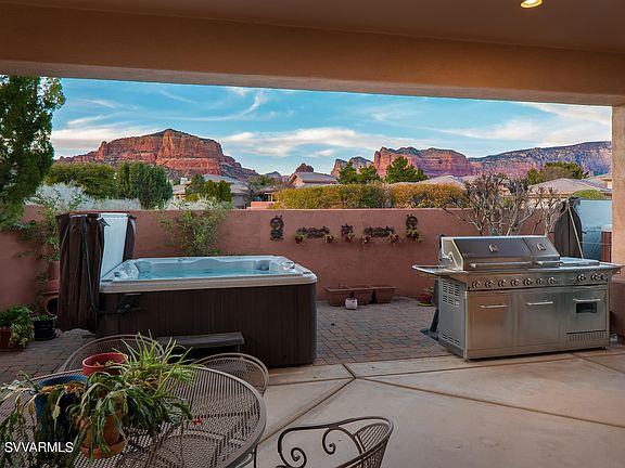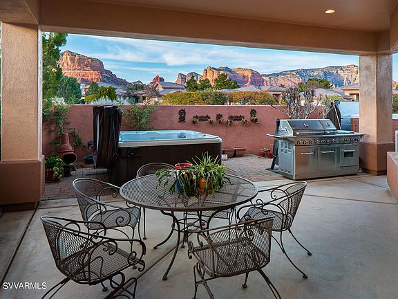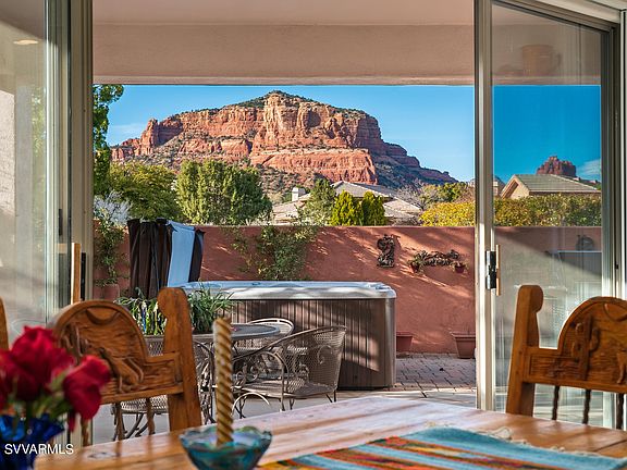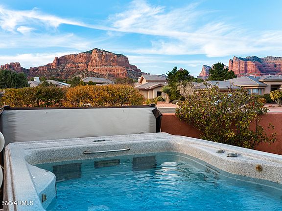 This well cared for home in Sedona Golf Resort features stunning Red Rock Views! Relax in your resort style back yard overlooking Cathedral Rock, Courthouse Butte and Bell Rock! The huge windows and expansive sliders bring the outdoors in, offering a stunning view from every room! The covered patio is an entertainers delight. Situated away from the golf course on a quiet cul-de-sac you can relax in style in your hot tub and Michel Phelps Swim Spa. Two spacious Primary Bedroom Suites with Full En-Suite Baths. The main primary bath features beautiful imported green marble from Italy, a true spa-like feeling right at home! Complete with a gas fireplace in the living room, owned solar, and beautiful cabinetry in the garage, make this home an easy choice!