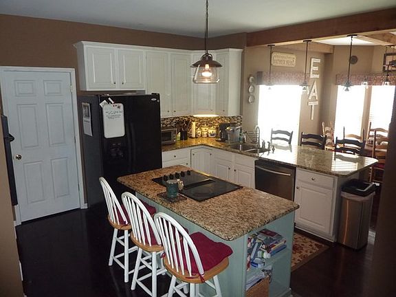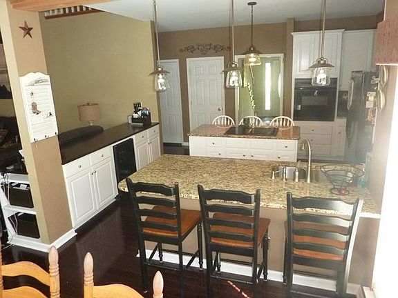 Impress your friends and family with your exclusive lakefront home with private dock (stocked w/varieties of game fish), open kitchen plan with granite countertops and bay window dining, custom cabinets with build-in wine cooler and massive stonework towering above the western cedar hearth. Two master bedrooms (one on the main level and the other on the second floor) with beautiful lake views. Enjoy your finished daylight basement and large bonus room for recreation, exercise, woodshop or man cave. Your main floor opens to a large covered deck (which also serves as covered parking for two vehicles) overlooking your private pool and extended sun deck. A rocking chair front porch greets your guests, 9 ft. ceilings and Taun solid hardwood flooring. Must See!