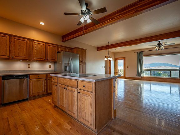 Stunning home just minutes from downtown Livingston. Sits on 2.8 acres and offers breathtaking views. The home boasts a spacious open-concept layout, Primary bedroom with ensuite, and a second bedroom on the first floor. The basement includes an additional two bedrooms and full bath. Both floors offer spacious living areas, the first floor has hardwood floors through out, and the basement has beautiful carpet, with the exception of the bathroom. The 2 car garage and basement offer tons of storage space. Lovely, fenced in courtyard in the back with established trees and shrubs, and large concrete patio area. All appliances included. Gorgeous fireplace in living/dining area,