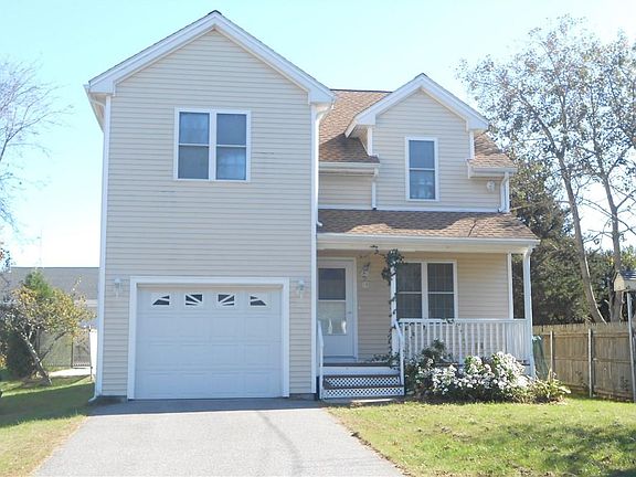 Sunlit colonial in Common Fence Point. Oak kitchen with appliances and an island, dining area has a slider to the deck. Spacious living rom, hardwood floors. Half bath. Open stairway to the upper level, 3 bedrooms, ample closets, full bath, laundry area. Full unfinished basement. One car garage. Garden shed. This house has an extra driveway in the back, for more parking. Walk to the beach at the end of the street. Quick access to Rt 24.