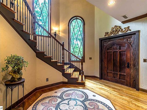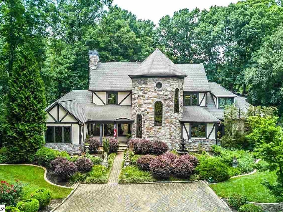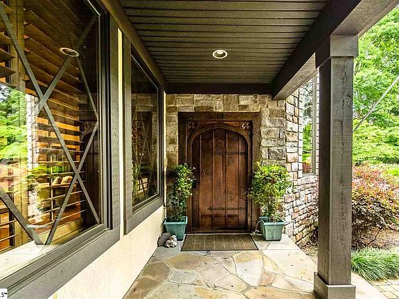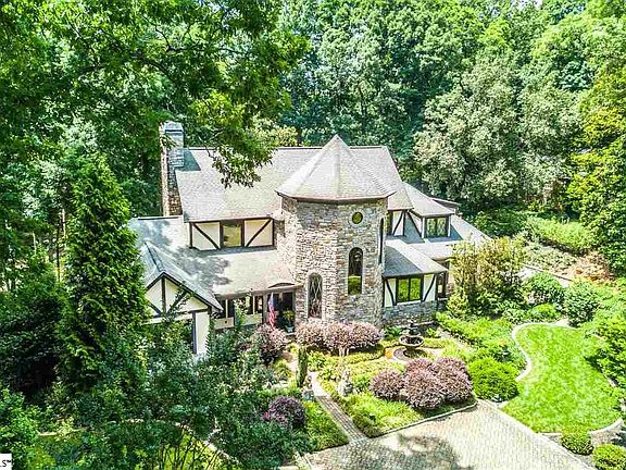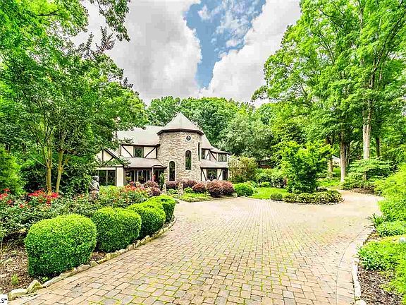 Presented by Sam Hankins at BHHS C. Dan Joyner, REALTORS® as part of the Luxury Collection, please contact Sam at 864-561-8119 for more information. Hidden off the beaten path is one of Greenville's finest homes. This stunning Tudor-European designed homes is breathtaking. The lush and professionally-designed landscape greets you as you arrive and drive into the impressive driveway completed with quality luxury pavers. Splendid architectural design will be recognized as you approach the front door. When entering the home you are welcomed to a warm and inviting two-story foyer with wrap-around staircase draws your eyes upward to an awe-inspiring octagon ceiling with superb chandelier which points to beautifully well-done artistic tile work on the floor of the foyer. This guides you into the stunning great room with six large windows that showcase each element of the space with two large chandeliers, floor to ceiling stone fireplace, and stunning wooden beams. The dining room space is large enough to entertain. Kitchen features spacious breakfast space overlooking the garden and stainless steel appliances, island, wine cabinet, under-cabinet lighting and window above overlooking the garden above the sink. Two bedrooms with a shared full bath and laundry are included on main level. Head up the winding stair case to your own get-away into a loft area and large master bedroom with spacious master bath, two walk-in closets, jetted tub and balcony overlooking the backyard space. Continue down to the basement where there is more entertainment space complete with a wood-burning fireplace, office, exercise room, bedroom, full-bath including a Sauna. Plumbing is in place to install a wet-bar beside fireplace. The exterior stucco has been professionally inspected and a warranty on the stucco is in place and transferrable to the buyer. Come and experience this home today!