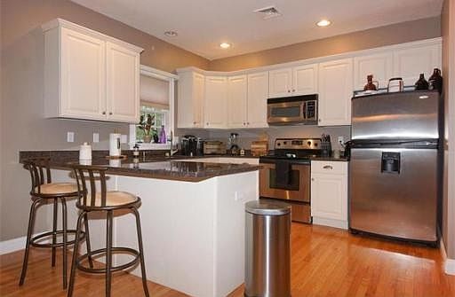 Gorgeous corner condo unit in the heart of Hudson, MA. Located in a secluded area, this customized updated home has high end finishes including hardwood floors throughout the main level and stairs. Open concept kitchen with crown molding, white kitchen cabinets, stainless steel appliances and granite countertops. Breakfast bar adjacent to dining room area. Spacious cathedral ceilings in the master bedroom with an en suite full bath and walk in closet. An additional full bathroom is located upstairs and a half bathroom on the main level. Basement can be finished and made into an office, 3rd bedroom or a playroom. Unit has central air, energy efficient gas heat and a one car garage. Great price, high end upgrades and a private location.
