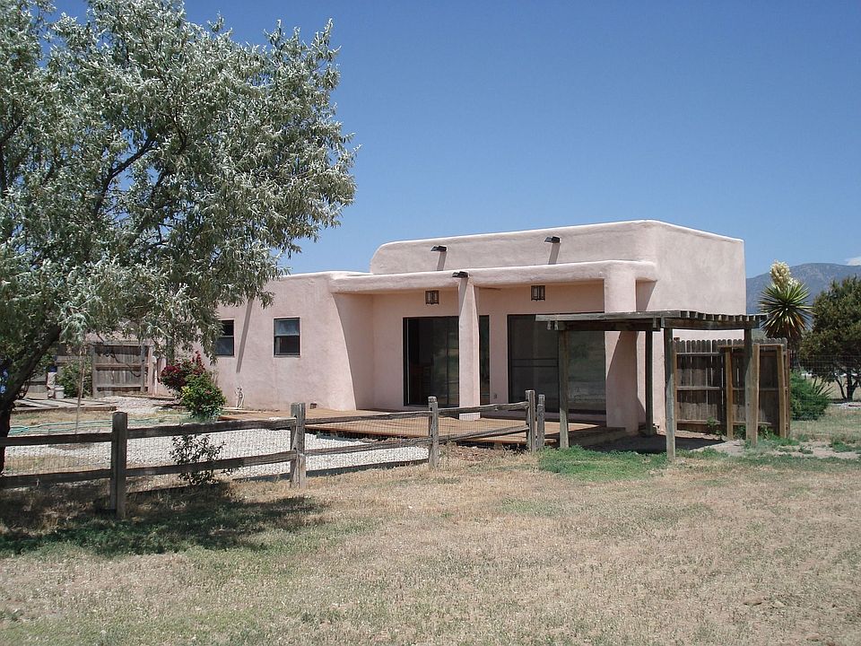 FANTASTIC Southwest Style home with Passive Solar gain. Huge south facing Windows in Living/Dining Room combination with brick floors for absorbing heat! Huge Master Bedroom with south facing picture window and door to backyard as well as a sliding glass door to a private courtyard. Kitchen with Bar and beautiful counters. Huge separate laundry room. Detached Garage is 24x24. Plus Additional storage shed and leanto for horses! Entranosa. All Inspections Done! Quick Close!