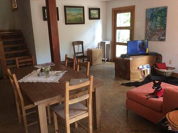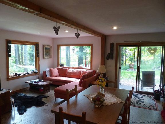 Unique passive solar, architect designed Woodstock contemporary in a beautiful yet not secluded wooded setting, surrounded by glacial rock outcroppings. Southern exposure home faces south by southwest - an ideal position in this area. This hand crafted custom home features wood floors and trim from trees harvested from the land. First floor features an open floor plan with concrete slab floors with radiant heat, chef's kitchen with stainless steel appliances and custom blue-stone counters, and a full bath. There are large windows and glass doors throughout to let the sunshine in. Two bedrooms and a full bath on the second floor. Both bedrooms have high ceilings and both have access to deck. Loft space on the third floor, also has access to the private roof top deck, with seasonal views of beautiful Cooper Lake. The home is close to the center of Woodstock & Phoenicia, Route 212 and on the Trailways bus route. It'a a perfect space for full timers and weekenders alike.