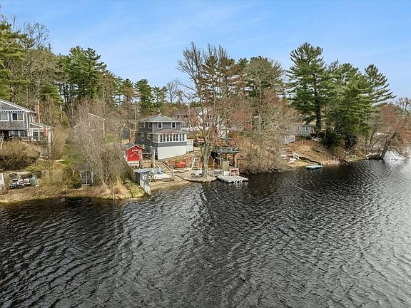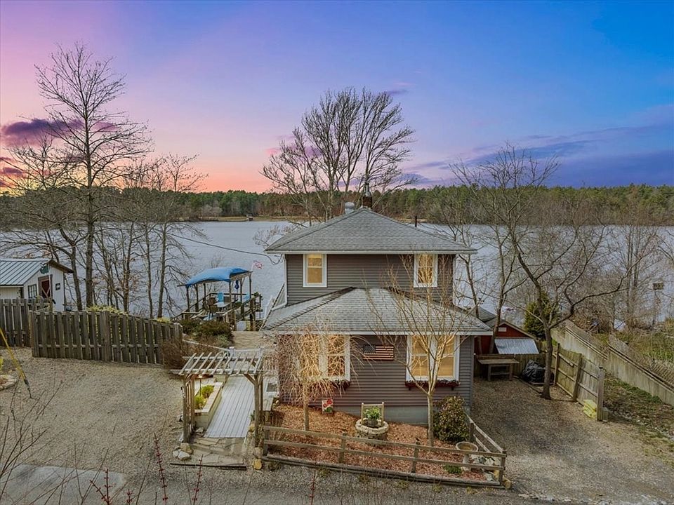 Welcome to this charming lakeside retreat tucked away on the shores of peaceful, private Woods Pond. This home offers a cozy haven amidst nature's beauty. Step inside the warm, welcoming interior where simplicity meets comfort. The living room invites you to unwind by a cozy fire, creating an intimate space for relaxation and gathering. The kitchen and dining areas are thoughtfully designed, featuring stunning views of the pond and ample counter space for meal prep. Retire to the master bedroom, where views of the tranquil pond provide a place for peaceful rest and relaxation. Step outside to discover lake living at its best! This stunning outdoor space features a large deck for entertaining guests or savoring a cup of coffee on a quiet morning. Enjoy leisurely evenings watching the sunset by a crackling fire or relaxing on your private dock. With direct access to the lake, you'll have the opportunity to enjoy a wide variety of water sports including swimming, boating, and fishing.