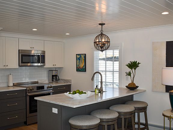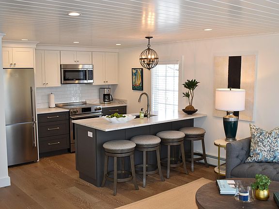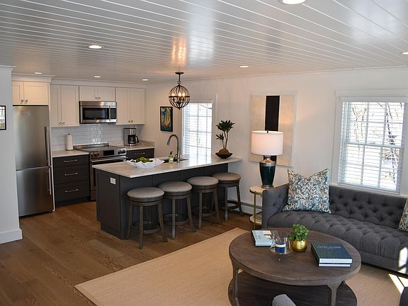 In Cape Porpoise, a once-unassuming structure has been transformed into an elegant coastal gem. The exterior, adorned with cedar clapboards, leads to a seamlessly styled interior. The kitchen boasts state-of-the-art appliances and a quartz-topped island. The property exudes tranquility with beautiful gardens, a fire pit and shared pool. This renovation in Cape Porpoise is a stylish blend of modernity and coastal charm.