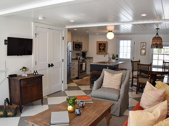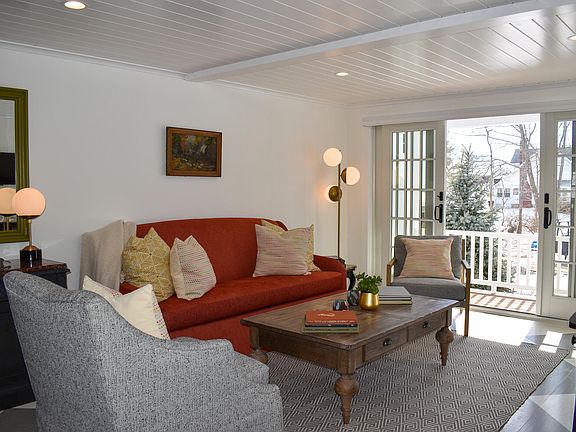 In Cape Porpoise, a once-unassuming structure has been transformed into an elegant coastal gem. The exterior, adorned with cedar clapboards, leads to a seamlessly styled interior. The kitchen boasts state-of-the-art appliances and a quartz-topped island. The property exudes tranquility with beautiful gardens, a fire pit and shared pool. This renovation in Cape Porpoise is a stylish blend of modernity and coastal charm.
