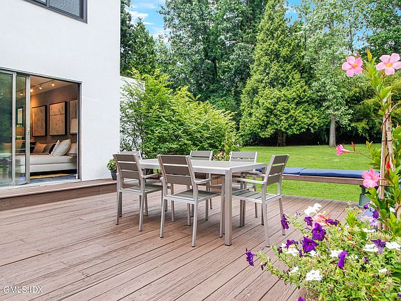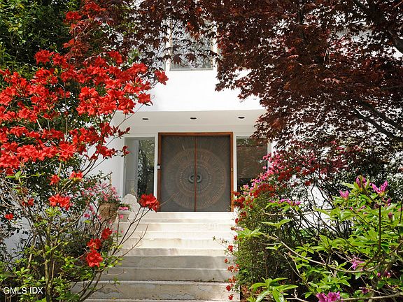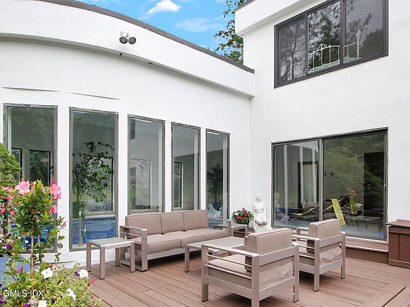 Two extraordinary bronze doors open to this elegant 7,400+ s.f. modern house that sits on 4.24 acres at end of a private cul-de-sac in backcountry Greenwich. Written up in several publications for its masterful design, the LR, DR and kitchen all open to a wide balcony that runs the length of the west side of the house and overlooks the yard and peaceful woods. The kitchen has a large center island, with cooktop and grill, and a breakfast nook surrounded by panoramic windows. You have an indoor pool, gym and sauna with a large hot tub just outside on the east deck which overlooks a large flat lawn. Upstairs is a large master suite with sunken bath, and 2 large walk-in closets. Also 2 en-suites BRs and an office with great views. Downstairs is an au-pair suite, game room and 3-car garage.