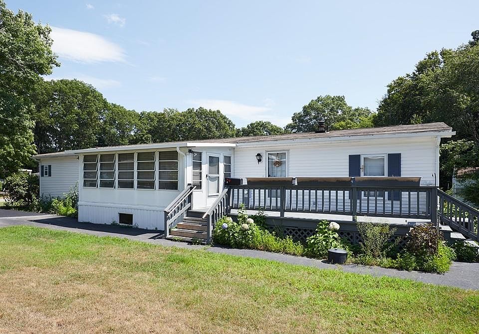 New Price! Spacious and well kept double wide unit in the desirable Matfield Woods 55+ neighborhood in West Bridgewater! This one owner unit has over 1700 square feet of living, three large bedrooms and two full baths, including a large master bath with separate shower and soaking tub. The kitchen has been upgraded with quartz countertops, stainless double wall ovens and a large kitchen pantry with swing out doors and tons of space. The living room and family room area has an open floor plan, built in bookshelves, and plenty of room to entertain. The main living area and master bedroom have high ceilings and plenty of windows to let the light shine in. Many upgrades including brand new water heater & faucets in bathrooms just installed, HVAC system just cleaned & serviced, newer carpet throughout the main living area, two driveways (unique to this unit), a three season sun porch & large deck which overlooks a private backyard and much more!