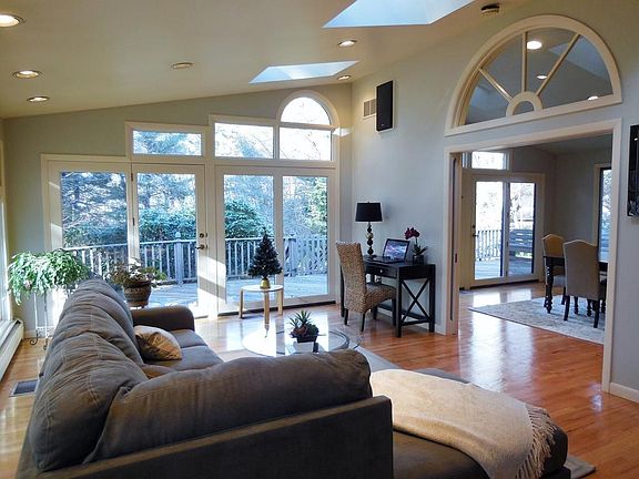 Mid Century Modern Home in Lindor Heights!! This lovely, BRIGHT residence offers many ideas for living! 4 levels of freshly painted and redone oak floors are open and contemporary! The house has skylights and architectural windows and cathedral ceilings throughout! The first floor is open and ready for a huge party!! The kitchen is stunning with amazing storage, a breakfast nook and a veg prep area! A fun covered patio and huge deck overlooking the +1.5 acres of yard and woods and your own private pond!! This house is also perfect for a HOME OFFICE!! The oversized 2 car garage completes the picture. The neighborhood is close to everything: 10 minutes to Noho and Springfield; 5 minutes to Rt 90!