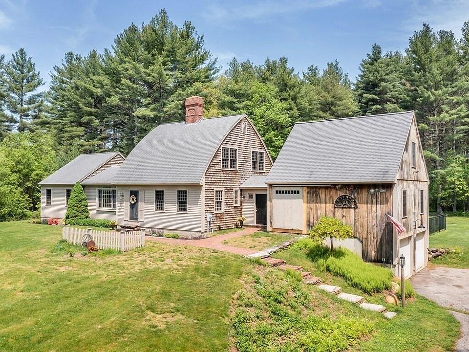 Stunning bow roof Cape on 6.04 Acres! Quintessential New England center chimney reproduction with a modern open floor plan! 12 over 12 windows & ash hardwood flooring throughout! Sun-filled kitchen w/handmade custom cabinets, soap stone counter and sink, commanding wood peninsula & new stainless appliances opens to a lovely dining room with wood burning fireplace. Spacious family room with vaulted ceiling has 2 French doors leading to a covered, mahogany entertaining deck overlooking your 18x36 SALT WATER POOL w/stainless powder coated fence. 1st floor main bedroom w/vaulted ceiling, double closets & full tiled, custom bath. Another 1st floor bedroom and 1/2 bath if needed for multi generational living. Private,1st floor office wing incl possible 5th bedroom! 2nd floor has 2 large bedrooms, landing with storage/linen closet and full bath. 2 car under garage & detached barn/workshop w/carport & dog kennel/coop. COMPLETE PRIVACY on over 6 ACRES on low traveled, dead end, country road!