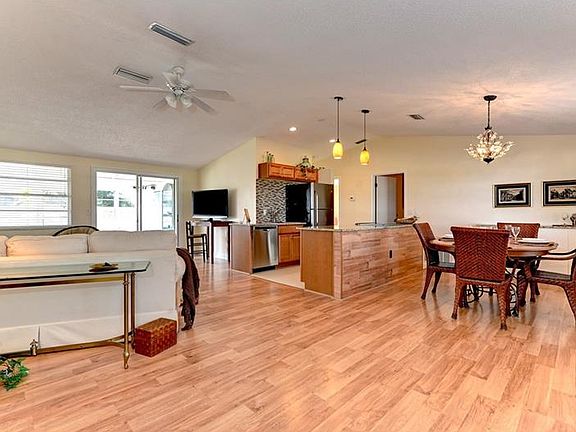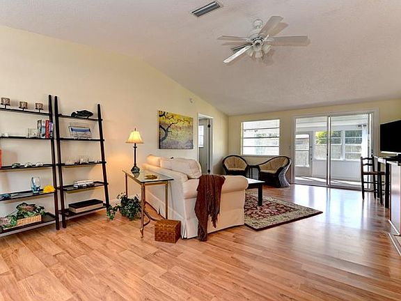 This 2 bedroom/2 bath charmer in emergent South Venice surprises and delights the moment you cross the threshold. Enter along the new paver sidewalk and landscaping to find the eye-catching glass tile backsplash and stainless appliances. The open granite kitchen area with custom island spills into both the large living and dining areas, below a vaulted ceiling. With a large, fenced private backyard, it's perfect for entertaining both indoors and out. A bright sunroom with copious windows and new bead board further extend the living area. Wide baseboards, new blinds and ceiling fans, a built in buffet, modern flooring, fresh paint throughout and pendant lighting all help round out the unique appointments in this quaint home. With ample sized bathrooms and closets, this airy and split floor plan, with new fixtures, is the perfect use of space for it's new homeowner. South Venice is home to a private boat ramp and the South Venice Beach Ferry that sails daily to the private beach! Bicycle to Shamrock Park and Nature Center, the Venice Waterway Trail and catch The Legacy Trail! New roof in 2016. Don't miss the additional 4'x7' work space in the garage! For additional info on the community, please visit southvenicebeach org