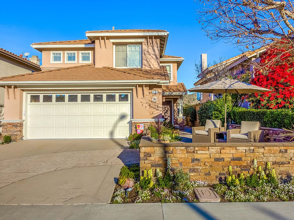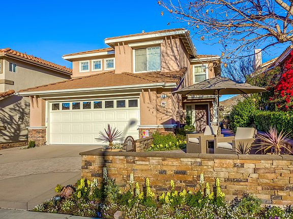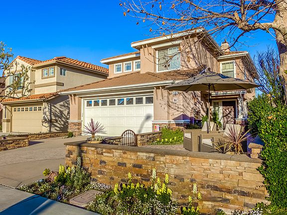 Spectacular POOL home with incredible canyon, hills and romantic sunset views nestled in the wonderful hillside community of Foothill Ranch!! This lovely home offers 4 bedrooms, 2.5 baths plus a loft which is ideal for the kids' play area or office. Home has beautiful curb appeal with colorful plantings and gated front courtyard enclosed in gorgeous stacked stone leading to a paved entrance way with a tranquil fountain. Impress your guests with the spacious formal living room featuring a custom 3-sided fireplace, elegant crown molding throughout, loads of windows for abundant natural light, plantation shutters and upgraded ceiling fans throughout, neutral paint and carpeting.The sunny kitchen overlooking the pool is a delight boasting Euro white cabinetry, granite counter tops, stainless steel appliances, and large kitchen island.The large master suite offers fantastic canyon views from the balcony complete with shade awning - perfect for your morning cup of coffee. The master bath offers dual sinks, glass-enclosed shower, soaking tub with views,Euro white cabinets, upgraded fixtures, and mirrored doors with walk-in closet.The entertainer's backyard boasts panoramic views, sparkling pool with stacked stone waterfall, raised entertaining area to watch the sunset, and built-in BBQ area with stacked stone counter and seating. This home has it all plus it's located just a short walk to award-winning, Blue Ribbon elementary school, shopping, dining, and theaters. HURRY...WON'T LAST LONG!!