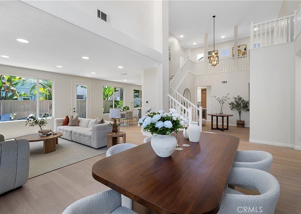 NEWLY REMODELED CORNER UNIT! Nestled in the coveted Lyon Ridge community of Aliso Viejo, this stunning 4-bedroom, 4-bath corner-unit home has been completely transformed with high-end finishes and thoughtful upgrades throughout. Step inside to soaring ceilings, an open floor plan, and a sun-drenched dining and living room that flows seamlessly into a designer kitchen—featuring sleek new cabinets, sparkling countertops, Thor stainless steel appliances, a built-in wine fridge, and a convenient pot filler above the stove—perfect for entertaining or everyday cooking. Rich engineered hardwood floors run throughout the entire home, leading to a spacious downstairs suite with its own ensuite full bath—ideal for guests, a home office, or a future in-law retreat. Another full bath and laundry room complete the first floor. Upstairs, the expansive primary suite offers a peaceful escape, while two additional bedrooms share a beautifully remodeled bath. The home also features a brand new HVAC system for year-round comfort. Located within walking distance to top-rated St. Mary’s private school and award-winning public schools, and just minutes from Whole Foods, Costco, Trader Joe’s, and 99 Ranch Market—this home truly has it all.