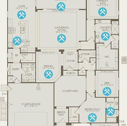 This is the Journey Plan in the Encore Series at Del Webb Rancho Mirage. Featuring a multi-panel slider in Gathering room, glass walk-in shower in Owner's bath, a Waterfall kitchen island, stacked cabinets, and a pro kitchen. Desirable south-facing homesite on walking trail. Floorplan rendering with furniture is for representation only and not included with purchase.