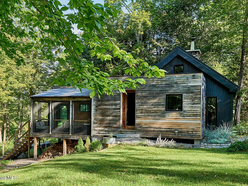 The main house offers two bedrooms plus a flexible loft, one full bath and one half bath. The primary suite faces the forest, and nearly every room is oriented to bring the outdoors in. A screened porch, wood stove, and outdoor dining areas extend living into all seasons.