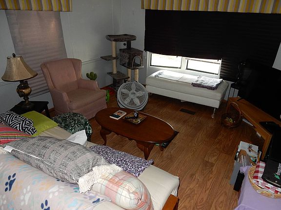 15 Martin Drive, Ellenton FL 34222 55+ Community. This home is on a rented/leased lot. This 1BR/1BA home, it comes with an enclosed lanai with vinyl windows. The home is cooled by central AC. The floors are laminate in the living room, hall and bedroom, there is linoleum in the bath. There is a one car carport. It has an open LR/DR/Kitchen floor plan. The dining area opens into the kitchen, refrigerator, oven/range, and a microwave. The large master bedroom has a ceiling fan, and double wall closets. The bathroom has an upgraded single sink vanity and a shower/tub combo. Lot rent includes water, sewer, trash, lawn, clubhouse and many community activities.