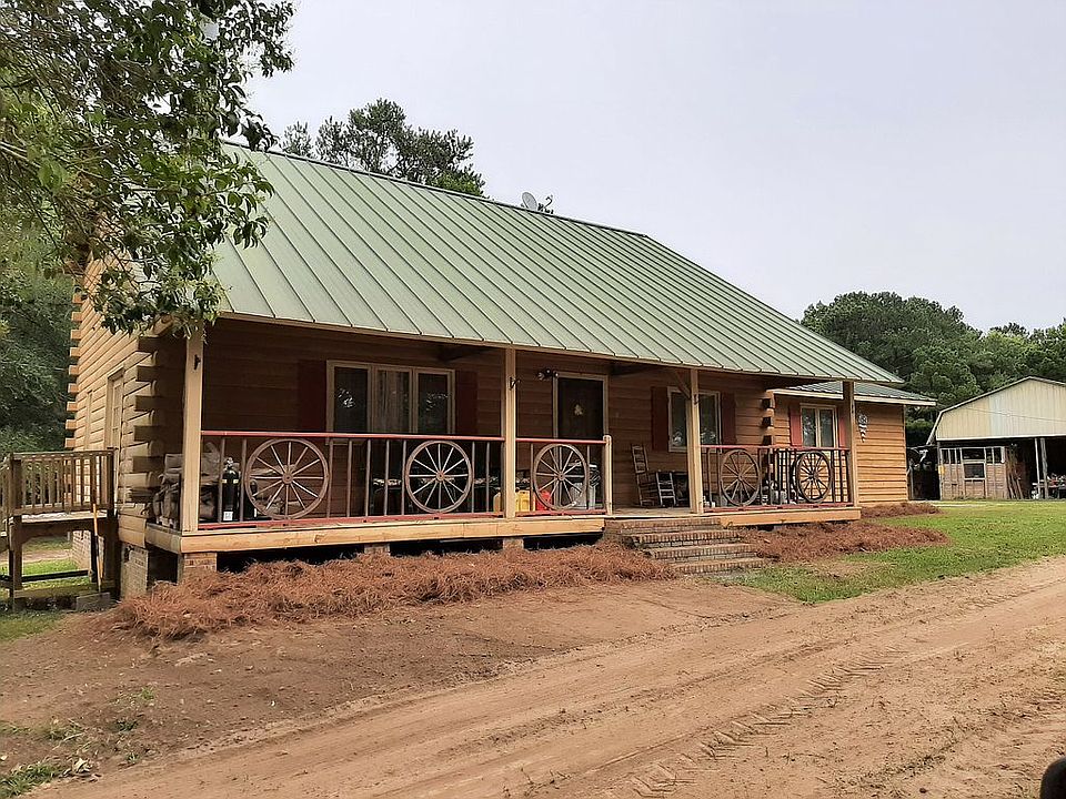 This is a salt box style 2 story with vaulted ceiling tonge and groove southern notty pine log home with a stone fireplace in th living room and a cast Iron pot belly stove in the vaulted ceiling front room. This sets on a very private 10 acres surronded on 3 sides by the black river backwaters 6 miles from Kingstree, 9 miles from Salters, 3 miles from greelyville right off HWY 52. There is a 8 stall horse barn with storage for tools boats and tractors, a corral and riding arena a motherin law suite with bunk house, and a pole barn for hay and agricultural equipment and supplies. We have our own well, seperate power and fiber optic cable internet for 3 of the buildings. lots of riding trails and 400 acres of pine farm on remaining side.