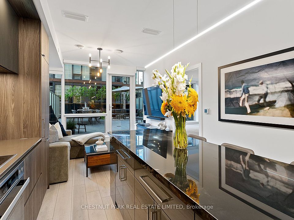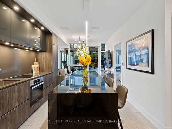 This isn't just any NOBU suite, it comes with 1,352 square feet of indoor and outdoor space, a premium parking spot ($$$), and custom upgrades throughout. Step inside this one of a kind residence in the heart of King West, upgraded throughout with thoughtful design. The kitchen boasts a custom porcelain island with built in cabinetry and wine nook, complemented by quartz countertops, backsplash, and seamlessly integrated Miele appliances. The living room offers a matching built in entertainment unit, but who needs TV when you have an entertainers dream 700 square foot terrace with the CN Tower peeking onto it. Spend your afternoons lounging in the sun before hosting cocktail parties or extravagant dinners, the event possibilities are endless. Back inside, the primary bedroom overlooks the terrace and includes custom closets and a three piece ensuite. The second bedroom sits just off the kitchen, with access to a four piece bathroom featuring custom shower glass. A laundry room with custom shelving adds convenience, while lighting has been upgraded throughout and paired with electric blinds for modern comfort. Rare premium parking spot located directly in front of the elevator. NOBU Residences redefines luxury living with world class amenities including fitness, yoga, and spin studios, hot and cold plunges, sauna, steam room, massage room, games lounge, screening room, and BBQ terraces.The building is anchored by the iconic Nobu Restaurant and offers 24/7 concierge, a pet spa, bike storage, and a rooftop zen garden.
