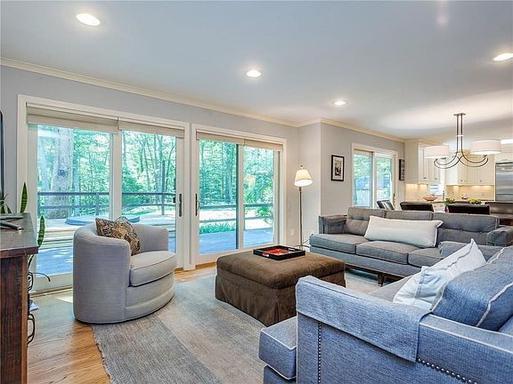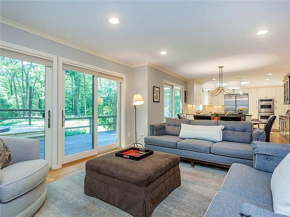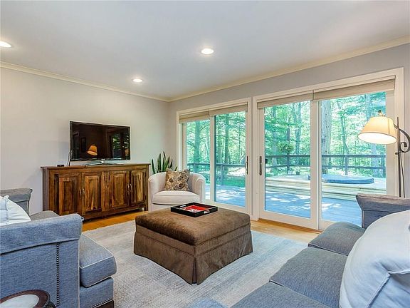 Tree lined driveway leads to the private setting of this rustic country colonial home on 3+ acres. Beautifully updated interior, hardwood floors throughout, the sunny kitchen with induction cook-top island and custom cabinetry opens to dining area and family room with sliders to deck. Spacious sun room offers tranquil nature views perfect for relaxing. Separate office space with built-ins. Living room features a library feel with custom shelving and fireplace with wood stove. 3 guest bedrooms, hall full bath and master bedroom on upper level. A spectacular master bath w/double marble vanity, walk in glass shower w/ marble, 2 rain shower heads, slipper tub and separate water closet complete the spa experience. Bonus room with separate entrance over garage includes vaulted ceiling, custom built-in shelving, hardwood floors, great for entertaining, possible in law or au pair. Super location near walking trails, only an hour and a half to NYC.
