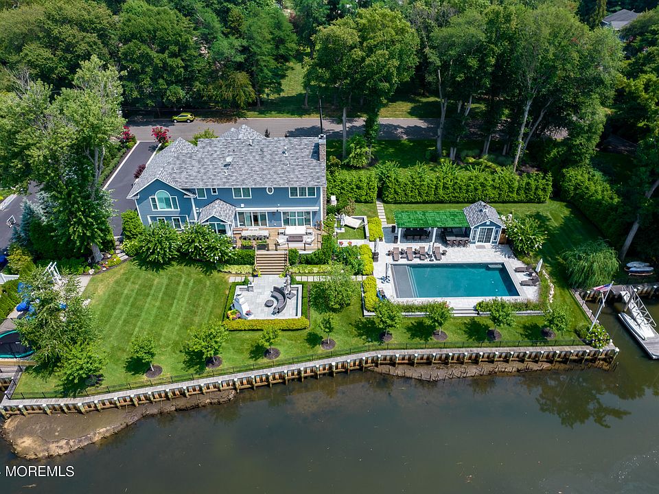 Indulge in resort-style living in this waterfront sanctuary offering 300 ft of bulkhead! An entertainer's dream, this thoughtfully constructed masterpiece combines sophisticated design with luxurious features. Enjoy the 10-foot ceilings throughout the formal dining room and chef's kitchen, complete with premium appliances and a convenient wet bar/butler's pantry. Upstairs, discover four bedrooms, laundry room, and a versatile bonus room that can be transformed into an additional bedroom. Retreat to the primary suite, offering a gas fireplace, 2 walk-in closets, marble bathroom, and picturesque views. Unwind by the wood-burning fireplace in the family room or step onto the spacious outdoor deck through sliding glass doors. Outdoor features include a wood burning fireplace, a stunning cabana, outdoor kitchen with pizza oven and heated gunite pool. Expansive grounds are surrounded by lush landscaping, a sprinkler system, new bulkhead, and a floating dock with deep inlet waterways. Additional highlights include a first-floor office, control 4 throughout, heated 3-car garage, generator and more. Embrace the resort lifestyle every day in this extraordinary home.