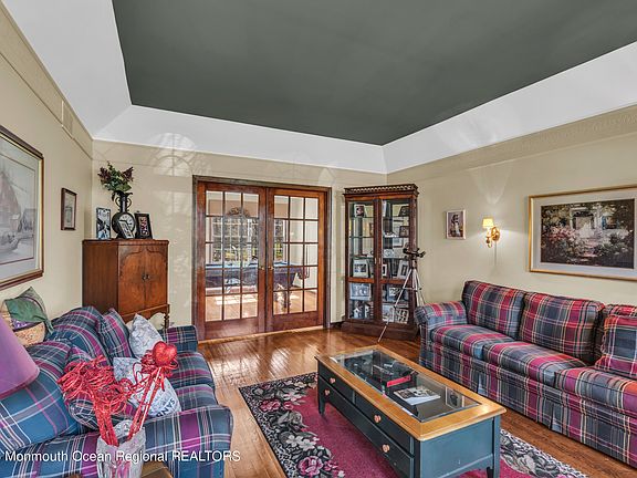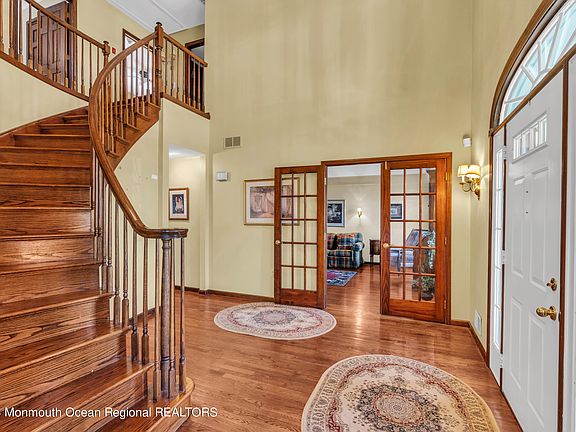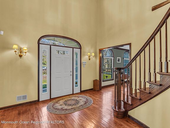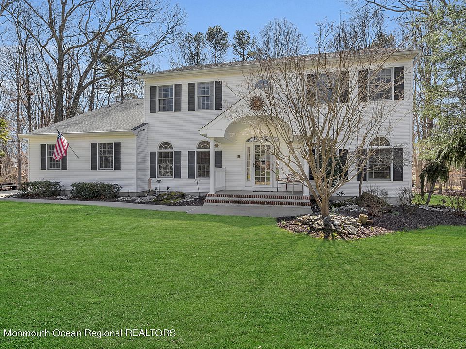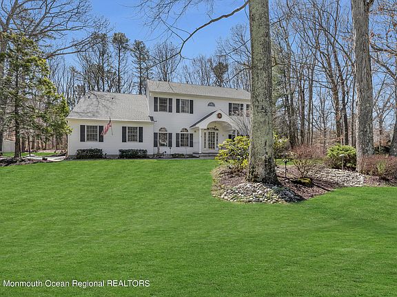 Desirable Freehold Twp offers this 5 bedroom, 4 bath colonial on 1.3 private acre lot with finished basement and 2 car garage. Guests are greeted in the 2 story foyer with sweeping staircase. 1st floor has large rooms including formal living room, dining room, game room, family room w/ vaulted ceilings, and wood fire place,eat-in kitchen with center island, granite tops, and tile flooring, large bedroom, and full bath. Features include wood floors, 9ft ceilings, French Doors, and recessed lighting. 2nd floor offers 4 bedrooms and 2 full baths including master suite with sitting area, walk-in closet and master bath with double sinks, jacuzzi tub, tiled shower. Exterior features oversized, 2 level trex deck, retractable awning, and storage shed.
