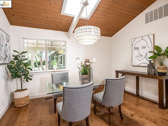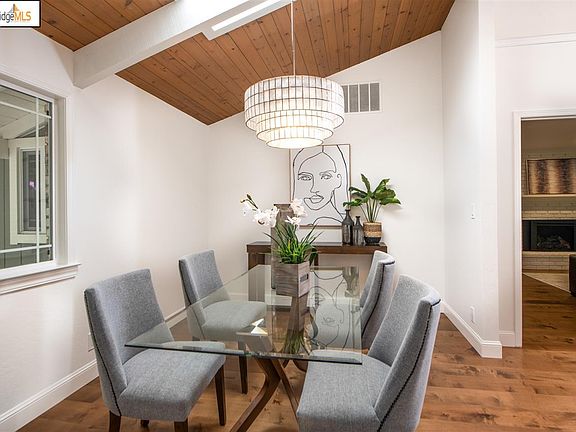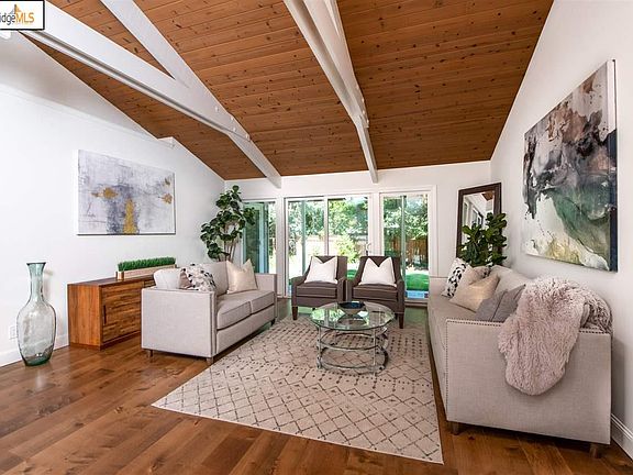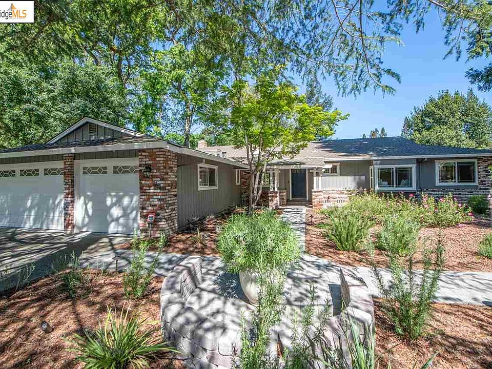 Delightful, modernized & updated one-level home situated on a quiet cul de sac. Professionally landscaped park-like setting with gorgeous mature Oaks, a seasonal creek, verdant lawns, patios, outdoor barbecue deck, fire pit and gazebo with hot tub. Spacious living room with vaulted ceilings and access to covered patio. Remodeled gourmet kitchen with granite counters, stainless steel appliances, gas stove, custom cabinetry and recessed lighting. Large family room with raised brick gas fireplace and hearth accented with recessed lighting. Generous sized Master bedroom with remodeled bath, 2 closets and sliding glass door leading to grounds. 3-car attached garage with new epoxy floor & built-in storage cabinets. Separate laundry room. Just minutes to schools, transportation, convenient freeway access. Near Walnut Creek and Danville. Iron Horse Trail at end of the block.