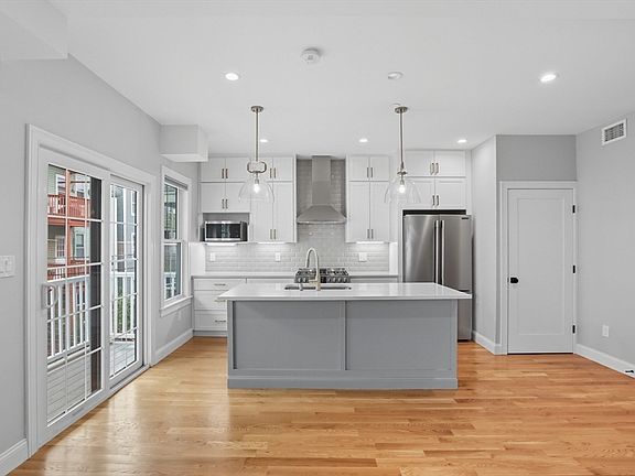 This luxurious 2 bedroom 2 bathroom condo is located in East Boston. Great open layout, with high end finishes. Living area features a Napolean Linear gas fireplace with built-ins flanking the fireplace. Beautiful kitchen with stainless steel appliances, gas stove with vented hood, ample cabinet space, quartz countertops, center island with built in cabinets, full dishwasher and built in microwave. This dream kitchen space is great for entertaining guests. White oak hardwood floors throughout. Common bathroom has a tub. Main en suite bathroom has a double sink vanity. Washer and Dryer in Unit. Enjoy time outside on your private back deck. Large designated storage space in the finished, temperature controlled basement. There is ample street parking. MBTA Airport T station and Bremen Street Park are located 0.2 miles from the property.