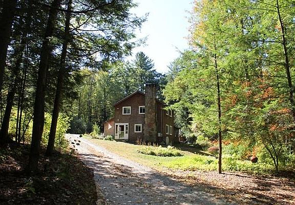 Tucked away at the top of Rustic Ridge set back from the road, this Rustic 4 season, year round home is surrounded by nature and walking trails that go for miles and miles. A perfect mixture of open land, gardens and surrounded by woods creates the ultimate privacy. The stone patio and stone walls around the house is accented by a brick, wood fired pizza oven off the deck and the 3 season enclosed porch with a cathedral ceiling and skylights. Bringing the outside in, the natural wood adds warmth to the inside. Stone fireplace in the living room that houses a wood stove and the pellet stove in the sitting room between the kitchen and 3 season porch that keeps the whole house toasty warm all winter. From the spacious dining room you can appreciate all 4 seasons from abundance of windows. 1st floor laundry room and bath. The Master Bedroom has its own mini spit and 1/2 bath. 2 additional rooms on the 2nd fl, 1 currently used as a large walk-in closet. Garage and carport add extra storage.