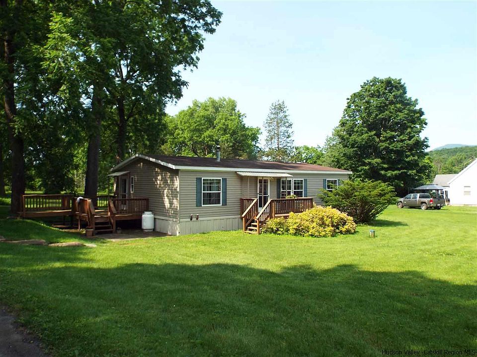 Immaculate and Spacious 2005 Double on 1-Acre. 3 Bed / 2 Bath with spacious yard in rear. Home located on a quiet cul-de-sac with little traffic and less than a half mile to NYS Thruway and about a mile to Village Center. Home is clean and move-in ready. 1344 Square Feet. Open Kitchen / Living Room area perfectfor entertaining. Property has 3 separate decks, one in back off living room, one off side of home is perfect size for cookouts and entertaining. One floor living and low maintenance. Raised septic in extreme rear of yard. There is also a new 1+ car detached garage which affords room for your vehicle in front and the previous owner has fitted the rear of garage for storage with shelving or could be a great spot for a workshop, etc. Rear of garage has equipment door as well for your mower or your motorcycle! Previous owner built a small enclosed room on far side of home to house tools, mowers, etc.