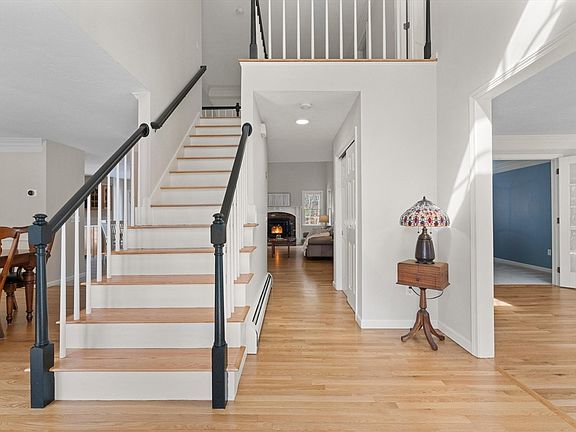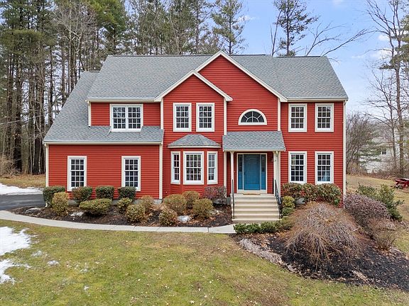 Custom built 4 bedroom, 2.5 bath colonial in The Ridings neighborhood with a highly desirable 'open floor plan' & 2 story entrance way. Formal living room w/ French doors leads to a home office w/ a view of the private backyard. Upon entering on your left of the Open Staircase is a 17'x11' formal dining room & bay window. The dining room flows into a vaulted ceiling family room w/fireplace(pellet stove) as well as a balcony overlooking & is open to an eat-in fully applianced kitchen. The 1/2 bath & separate laundry rm complete the 1st floor. The Main(master) suite(20x13) w/ an 8'x8' walk-in closet, & a 13x11 full bath w/ jacuzzi tub & separate shower is on the 2nd floor along with 3 good sized bedrooms & a hallway bath. There are beautiful hardwood floors throughout most of the 1st floor, a 2/3 acre private treed lot w/outdoor shed, and a side entry 2 car attached garage. Some of the improvements are a newer roof(2014), & recent furnace, oil tank, driveway, wall ovens & refrigerator.
