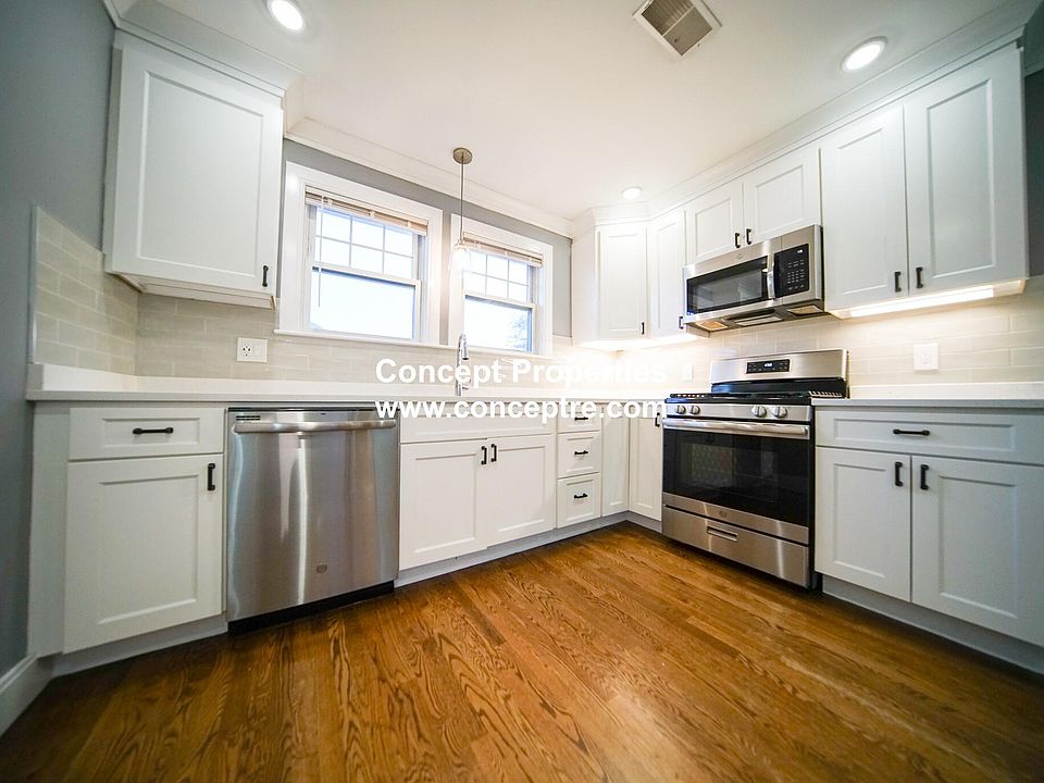 FREE OCTOBER RENT !! Beautiful 4 bedroom/1.5 bath unit modern kitchen with granite counter-tops and stainless steel appliances. Gleaming hardwood floors throughout. HVAC system. Laundry and storage in the basement. Lot's of On-street parking with a residential permit. We also have off-street tandem parking available for an additional cost. Less than 5 minutes walking distance to Green line train station, bus lines, restaurants and stores. Dogs are OK upon landlord approval for an additional $150 per month. Cats OK for an additional $75 per month Security deposit negotiable.