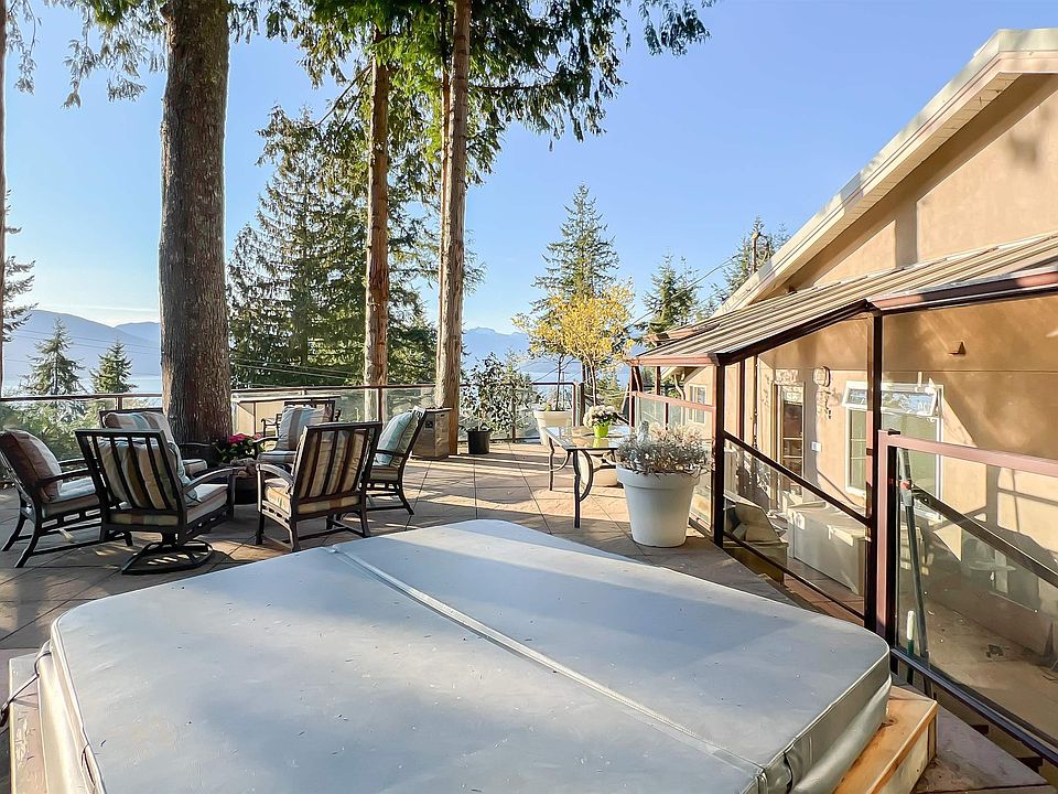 Welcome to Lions Bay featuring an incredible 4 bed 3 bath, 3,569 sf luxury entertainment beach home with PANORAMIC ocean views and westerly sunsets from the oversized deck w/ dual sided fireplace & hot tub. Step inside to an open layout w/ radiant in-floor heating, schonbek chandeliers, vaulted ceilings & windows, and skylights for ample natural light to the living area and chefs kitchen. French doors lead to the master bedroom w/ walk in shower, HUGE walk in closet and direct access to the sun drenched patio. Private 11,180 sf lot with a new metal roof, infrared sauna and strong rental income, this property has direct access to the Sea to Sky Highway. Short walk to transit, bistro, schools, world-class hiking, kayaking & beaches. Music community and home business bylaw friendly.