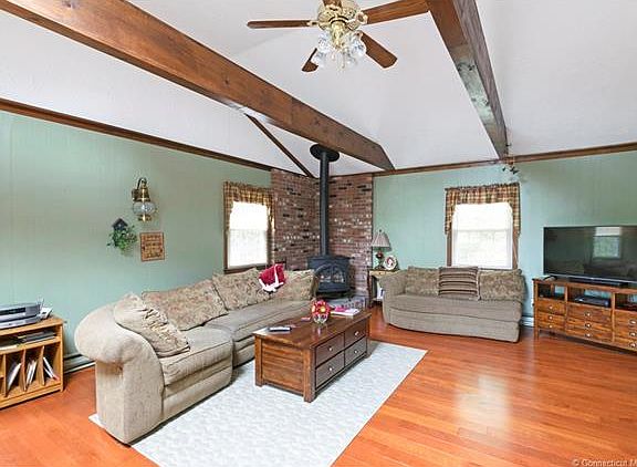 Lovely L-Shaped ranch home located in Northeast Bristol offering 1600 sq feet. You will love the spacious feel with this fabulous layout. The eat-in kitchen has newer appliances, tile floor and plenty of cabinets and leads to a sunken family room that is large enough for dining and relaxing. Included in the family room is propane stove that makes this a cozy room during cooler days. Sliders off the family room lead to a back deck, patio and level private back yard. Adding to his lovely layout is a formal living room with wood floors and a wood fireplace. The master bedroom has its own private 1/2 bath and all three bedrooms offer wood floors and double closets. Added amenities to this love home include central air, central vac, main floor laundry, newer rood and windows, an electric fence (controller included but buyer would need to supply collar) and a very large dry basement that is perfect for finishing should you desire more space. Electric heat budget is $251.00 a month and that is a bargain!