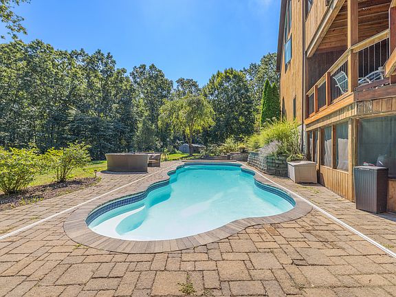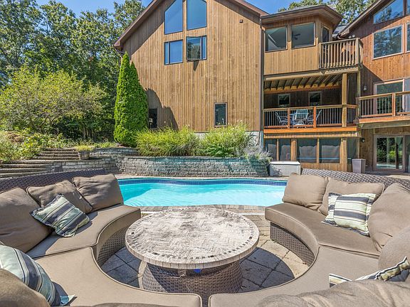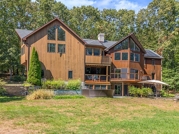 Minutes from rolling fields abutting Twomile Brook, this captivating 7 BR, 5 1/2 bath, 5200 s.f. modern chalet home is a perfect solution to much needed space for your family. Nestled into a wooded flag lot, the contemporary home features panoramas from the great room that spill out from the elevated mahogany deck over the in-ground pool. Perfect for entertaining a large party or any extended family for the holidays, the spacious kitchen was built for the aspiring host. Large 2-sided fireplace in the great room w/ wide plank wood floors. Master suite located off the main living volume, complete w/ his & her sinks, a gorgeous tiled double shower & a jacuzzi tub. Upstairs, there are 3 more large BRs opening into a vaulted loft area. A lower level that opens to the expansive 2000 SF patio pool area contains a massive den! Full bath & an additional BR within the lower level for that teen that needs a break from their siblings or even an au pair. Finishing off the lower level is a complete gym w/ professional rubber flooring. Over the 3-car garage is a fully independent 1200 sq ft in-law suite that has it all! An open floor concept that has a gorgeous kitchen & sweeping views of the estate are truly breath-taking. Another live in possibility is the 1 BR aupair quarters/apartment located in the lower level adjacent to the home gym. This space has a private entrance & full kitchen. Minutes to Merrit parkway , i95 , New Haven & Milford railroad stations. This house has it all!