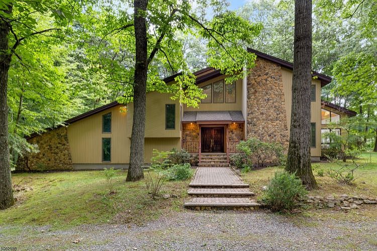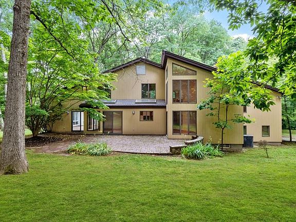 This unique contemporary, tucked away on a 4.4-acre lot in natural surroundings, offers privacy yet all the conveniences of nearby Chester town center. As you enter the front door, you'll immediately see the amazing floor to ceiling stone fireplace in the soaring family room. A sunken living room, formal dining room, and eat in kitchen with access to both a patio and large sunroom are perfect spots to entertain or relax. On the second level two bedrooms share a Jack and Jill bath. The primary bedroom suite on the upper level is spacious and features a fabulous walk-in closet and bath. The ground level is home to an office or guest room, laundry room, and storage room. The abundance of windows and skylights fill this wonderful home with natural light making it the perfect place for your new home!