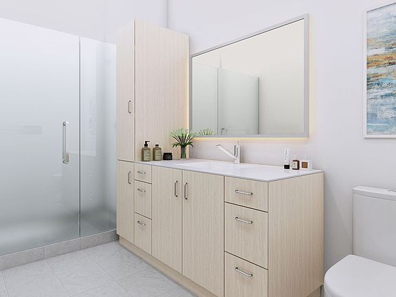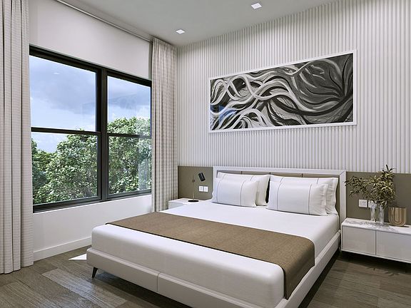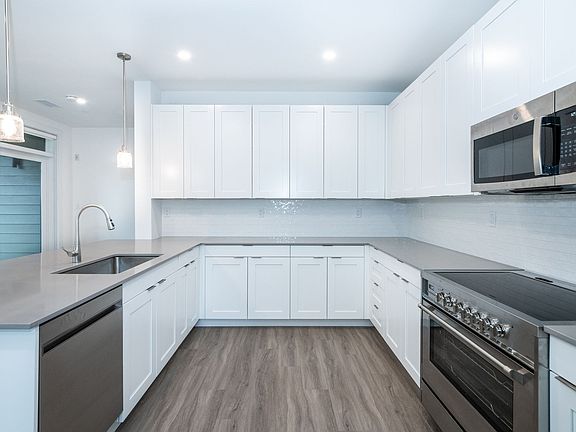 - Exterior features: Bedroom Blackout Shades, Bicycle storage, Co-Working Space, Custom cabinetry and Quartz counter tops, Extra large walk in fitted closets, Fitness Room, Gourmet kitchen with high end appliances, Ground level outdoor seating area, High ceilings, On site parking with EV chargers, Over sized windows, Package Receiving, Pet Washing Station, Rooftop Deck, Spacious Floor Plan
