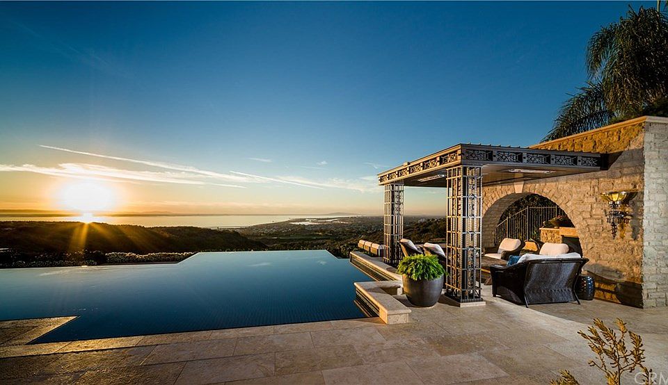 An extraordinary opportunity awaits in this award-winning custom estate, newly reconstructed in 2016. Evocative of a high-end luxury resort with no detail spared, this lavish residence exudes opulence and solitude at every turn. Each surface is adorned with luxurious bespoke finishes, from the Portuguese travertine and Italian walnut flooring in the main living areas, to the cork leather flooring in the game room, custom light fixtures and mixed media wall coverings created by local artists. The gourmet kitchen features quartz countertops, two temperature-controlled wine closets, and flows openly to the large great room with wet bar, formal dining room with sets of disappearing glass doors, and is surrounded by breathtaking ocean views. Each bedroom in the home offers a true ensuite, including a rare main-level guest suite. The second level presents two additional guest rooms and grandiose master wing with office, walk-in closets, fireplace, spa-like bathroom and three balconies. Grandeur and leisure convene in the magnificent backyard, boasting glass tiled infinity edge pool, multiple fire features, fireplace, covered outdoor kitchen, and sitting areas for soaking in the surrounding beauty. Fully integrated Control 4 automation, an elevator, and top-of-the-line security system offer seamless navigation and control of the residence. Ideally situated along a sprawling front row lot in guard-gated Pelican Crest, this home commands the most dramatic, unobstructed views.