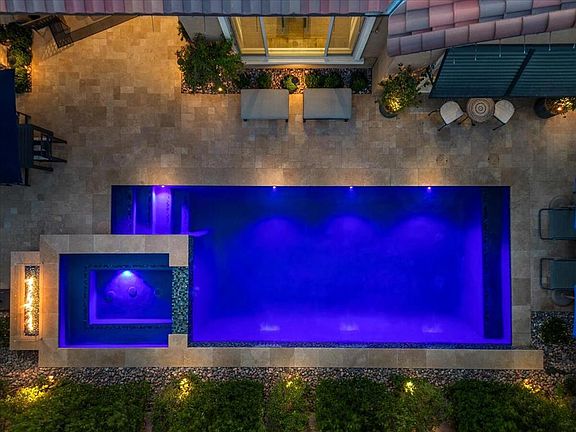 Step into this highly customized Tuscan Sanctuary plan, a model home of perfection. With OWNED SOLAR and a MODERN multi-panel glass front door, it's ready for its close-up. Throughout the house, porcelain wood-like tile flooring adds elegance. The gathering room impresses with a stacked stone fireplace and a MULTI-PANEL SLIDING GLASS DOOR system that invites indoor-outdoor living. The kitchen features a WATERFALL ISLAND, custom tile work, quartz counters, bronze designer hardware, and Whirlpool appliances. A cozy cafe area with custom lighting connects to the covered patio. The spacious owner's bedroom boasts a custom stacked stone feature wall, while the ensuite offers a ROLL-IN SHOWER w/Bench, dual sinks, and a walk-in closet. The guest bed features custom lighting and direct access to a hall bath. An office with a stacked stone feature wall completes the interior of this lovely floor plan. Custom shutters and upgraded electrical throughout add a special touch. Outside, travertine decking, lush landscaping, a POOL/SPA, and a FIRE PIT seal the deal. This home is a true gem, combining elegance and modernity.