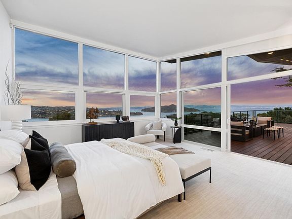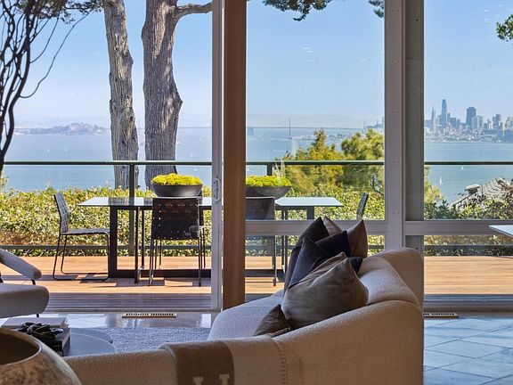 First time on the market in 34 years, this sleek and sexy mid-century modern offers jaw dropping views of the San Francisco skyline and Angel Island. Walls of glass and vaulted clear cedar ceilings create a dramatic aesthetic framing the sweeping vistas that make this home truly unforgettable! The open-concept design connects the great room and the gourmet kitchen seamlessly, flowing to an expansive Ipe deck and patio with outdoor fireplace and built-in BBQ, ideal for entertaining. The primary suite located on the main level features floor-to-ceiling windows that take advantage of the glistening bay views, a spacious walk-in closet and elegant marble bathroom. A 2nd en suite bedroom & guest powder room complete this floor. Lower level with glass walled family/media room showcasing the mature landscaped gardens includes a private entrance, kitchenette, laundry room and an oversized 3rd en suite bedroom with steam shower and private deck; perfect for an in-law or guest suite. Dedicated office or exercise room, provides flexibility. This custom-built home on 1/4-acre lot in Sausalito's coveted upper Banana Belt, sits at the end of a private lane, with 2-car garage, covered carport & driveway for up to 6 cars. A true sanctuary with a rare blend of Luxury, Lifestyle, and Convenience~