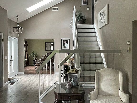 2.5 car garage, beautiful fruit trees, in ground sprinkles, central air-conditioning with two separate units to control both floors of the home, and central vacuum.