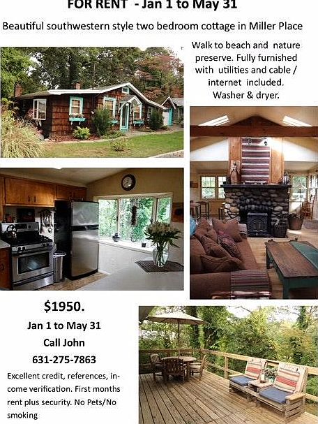 6 month lease (Jan 1, 2018-May 31, 2018). Must have strong credit, first month rent and security deposit required. No pets, no smoking. Please call 631-275-7863.