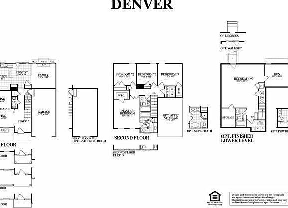 The Denver features 4 bedrooms, 2.5 baths, garage, family room, kitchen with breakfast nook, separate formal living room and dining room, second floor laundry, and master suite with walk-in closet.