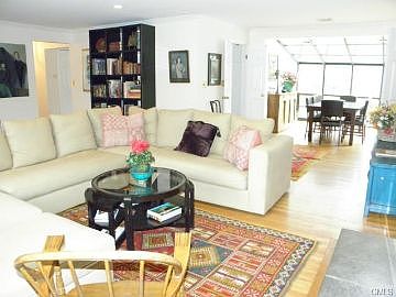 South Wilton, great family home, bright livingroom/dining, see thru fireplace in LR and Family Room, family room with built in bookcase and sliders to deck, huge fininshed lower level with new wwcarpet, bright kitchen w stainless steel apliances, master in separate "wing" - nice privacy, atrium dining room, large, flat lawns, stone wall, popular "Meadows" neighborhood South Wilton.