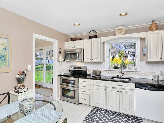 Inviting three bedroom split-level ranch, set on a lovely .43 acre, graces the end of a quiet cul-de-sac in a desirable neighborhood close to schools, shopping and highway. Rich hardwood floors line the gracious interior which boasts a striking 2016 renovated eat-in, granite-clad kitchen; living room with a fireplace and luminous picture window; dining room with sliding doors to a wonderful stone patio and expansive, level backyard dotted with mature landscaping. Upstairs features a master suite, two comfortable bedrooms, full hall bath and stairs to attic. The lower level offers a family room with a fireplace and outdoor access to detached two-car garage as well as a full bath and laundry room